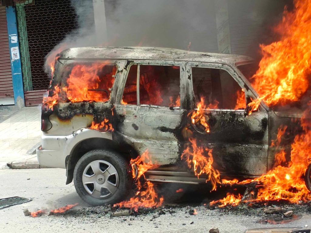 नगर प्रहरी कुट्नेलाई छाड्न माग गर्दै विद्यार्थीले गरे एउटा गाडीमा आगजनी, ५ वटामा तोडफोड