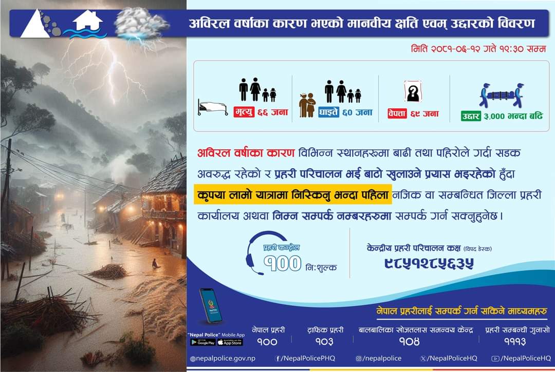 बाढी पहिराेले अहिले साँझसम्म ६६ को मृत्यु ।