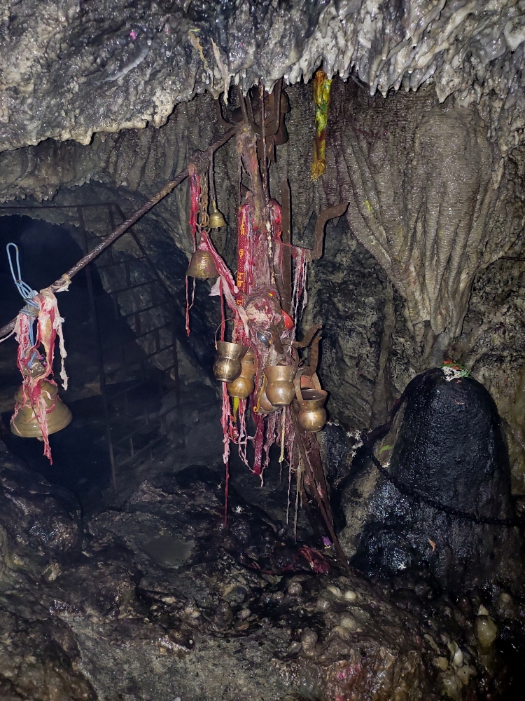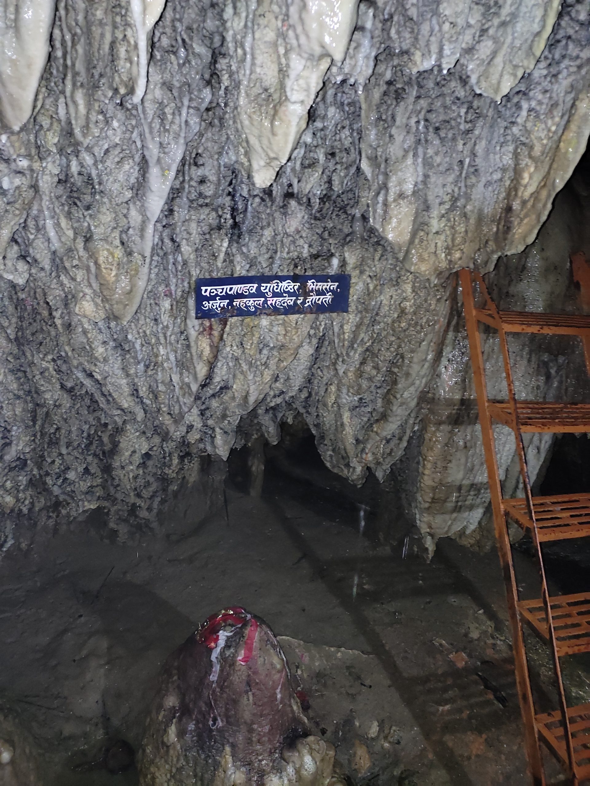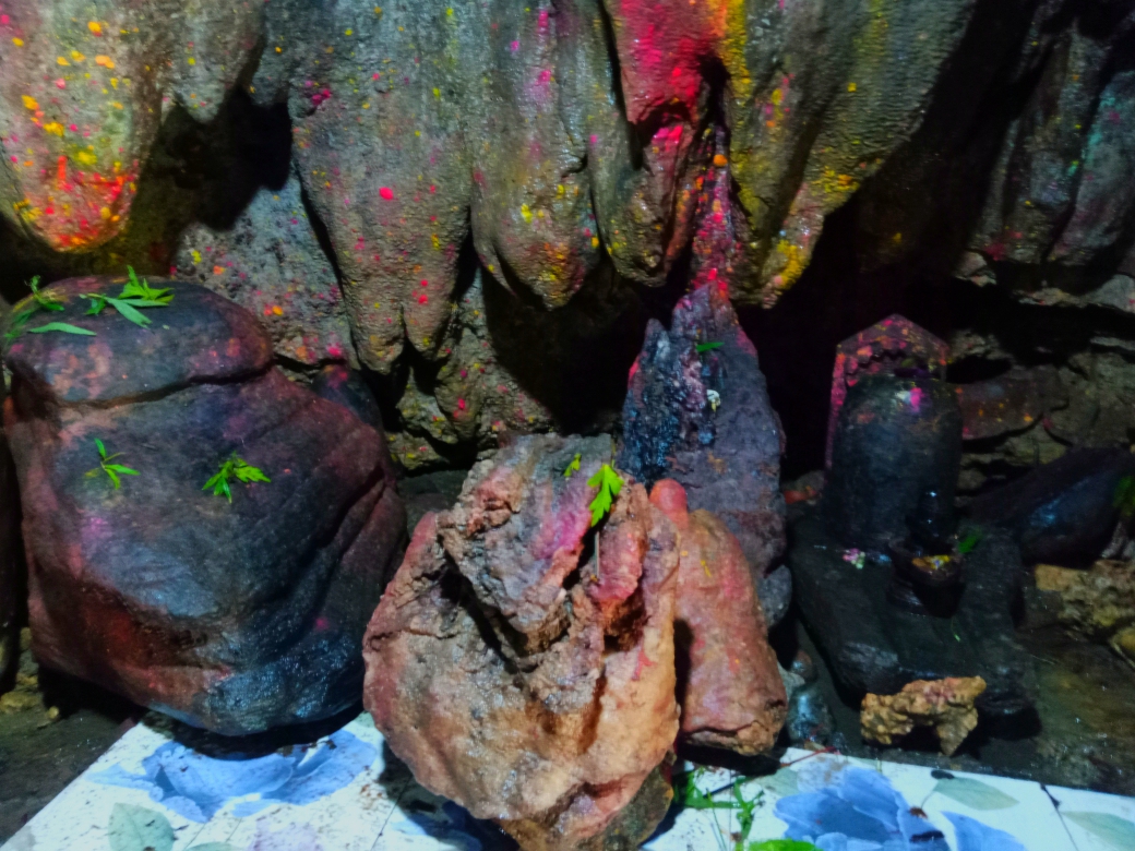 यसरी एकातिर पत्थर पत्थरले घेरिएको यस्तो ठाउँमा पनि कसरी र कहाँबाट पानी रसाएको होला भन्ने कुरा सोच्नुपर्छ भने अर्कोतिर प्राँखाअगाडिका भित्ताहरूमा देखिदै जाने विभिन्न किसिमका सुन्दर आकृति र प्रतिमाहरूले चित्तापित गराउँदछन् । अनि पचास मिटर जति दूरीका पहराहरूमा चुनले बनेका देवीदेवताहरूका प्रतिमाहरू प्रकाशमान देखिन्छन् । पहिले-पहिले यी मूर्ति र प्रतिमाहरू ज्यादै प्रकाशमय भएका हुँदा गुफाभित्र यिनकै प्रकाशले जान सकिन्थ्यो रे ! तर हाल त्यो सत्य सावित हुँदैन यी विभिन्न आकृतिका मूर्तिहरूमध्ये पहिले शिवजी र साथमा सढिको चित्र स्पष्ट देखिन्छ भने बाघ र सिंहको ग्राकार पनि अंकित छन् । यसरी नै मर्यादापुरुषोत्तम भगवान् रामचन्द्र, सीता र लक्ष्मण को साथमा रामभक्त हनूमानको भव्यमूर्ति छर्लङ्ग देखिन्छ भने कछुवाको हुबहु सुन्दर श्राकृतिले छक्क पार्दछ । हजार जिब्रा भएका शेषनाग भगवान् विष्णुका शिरको शोभा भई बसेको भव्य मूर्ति र सूर्यचन्द्रग्रंकित श्राकृतिहरू पनि देखिन्छन् । एकातिर फुटजति अग्लो शिवलिंग छ भने अर्कोतर्फ शिवजीको जटाबाट पानीको धारा अविरल बगिनं रहेको देखिन्छ । शिवको शिरबाट झरेको पानी ग्रीष्म ऋतुमा क्रमशः कम हुँदै जाने कुरा प्रत्यक्ष दर्शीहरूका भनाइबाट थाहा पाइन्छ । यस्तै चंदुवा टाँगिएको, मण्डप बनाइएको र मण्डपको वरि परि तेत्तीसकोटी देवता र ब्राह्मणहरू भेला भै देवसभाको रूपमा सभा बसेका जस्ता विहङ्गम दृश्यले हाम्रा प्राचीन ग्रन्थहरूमा उल्लिखित घटनाको ताजा स्मरण हुन्छ । यसपछि १०-१५ मिटर टाढाको अर्को कोप्चेरामा सुख्खा बुर्बुराउँदो खालको धूल-धूलो माटो भएको अलिकति जमीन भेटिन्छ । सो जमीनको दायाँपट्टि तरेखु (धान्ययज्ञ गर्दा खाग गराइएको खरानी) राखिएको पाइन्छ । तरेखुको दायाँपट्टि ढुङ्गाको नगरा बज्दछ । गुफा भित्र यस किसिमको बज्ने ढुङ्गा फेला पर्नु अचम्म लाग्दछ । क्रमशः अगाडि बढ्दै जाँदा ५० मिटर परको अर्को भित्तामा पञ्चपाण्डवका तन्दुरुस्त प्रतिमाहरू अंकित छन् । ती पाँच पाण्डवमध्ये नकुलको मूर्ति भाँचिएको पाइन्छ । यसरी अवलोकनको सिलसिलामा अन्य यस्ता कतिपय मूर्ति र प्रतिमाहरू हाल भाँचिएको अवस्थामा फेला पर्दछन् । त्यसदेखि केही पर काठको एउटा भन्याऊ ठड्याइएको छ, जुन जीर्ण अवस्थाको छ । उक्त गुफाभित्र सो भन्याङ कसले र कहिले राखेको हो पत्ता लाग्न सकेको छैन तापनि प्रवेशद्वारदेखि भन्याङ सम्मको करीब तीनसय दूरी परको यति ठूलो र फराकिलो अँध्यारो गुफाको भित्री एरियाबाट पनि दोस्रो खण्डको अर्को गुफाभित्र प्रवेश. गर्न एक-डेढ फुट जति पहरा फाटेको स्पष्ट देखिन्छ ।
