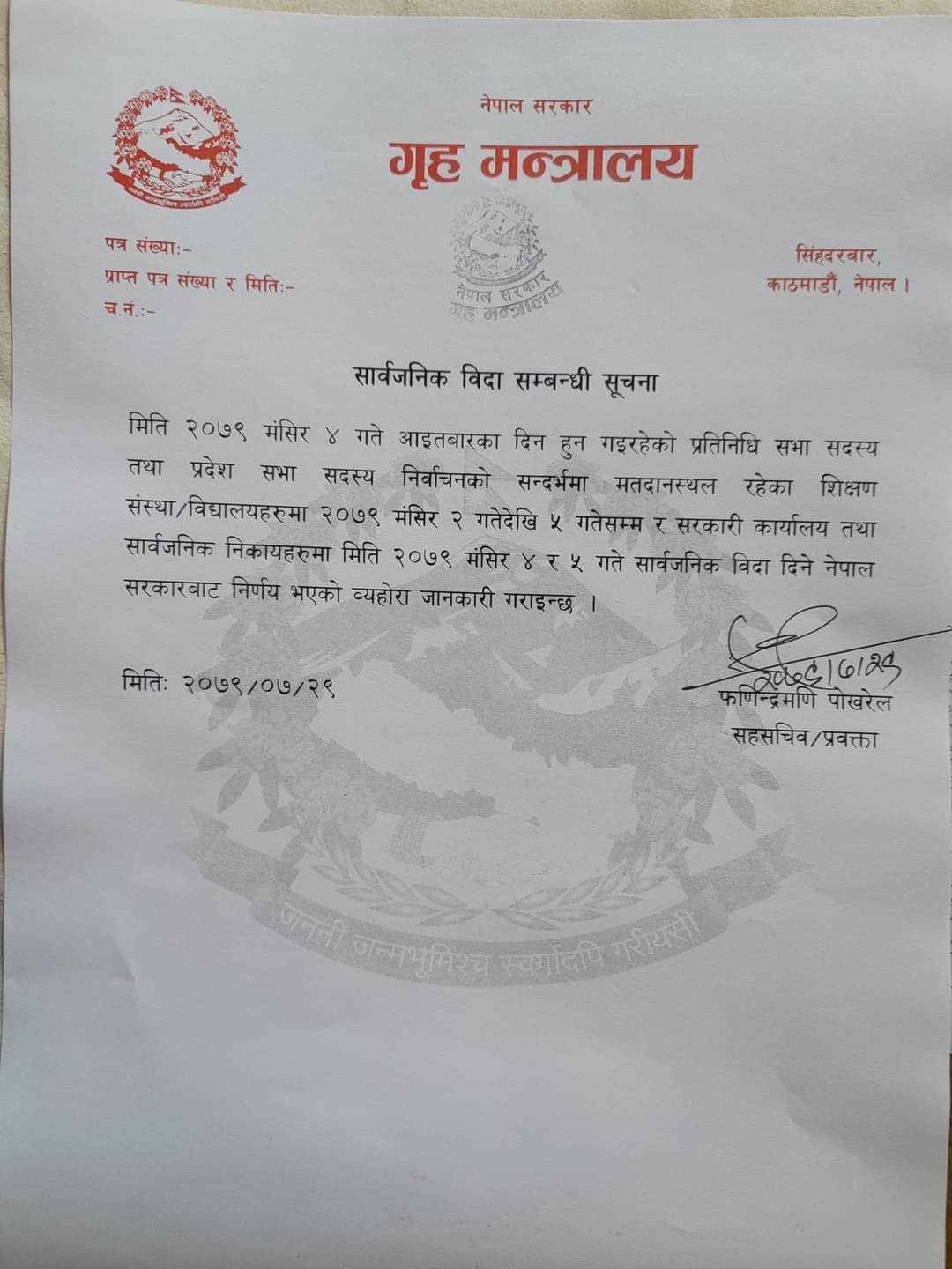 गृह मन्त्रालयलका प्रवक्ता फणिन्द्रमणि पोखरेलले जारी गरेको विज्ञप्तिमा २ मंसिरदेखि ५ मंसिरसम्म विद्यालय बिदा दिने निर्णय भएको उल्लेख छ ।