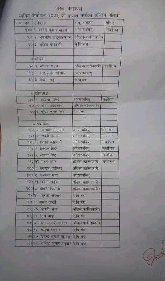 त्यसैगरी सचिवमा नेकपा माओवादी निकट अखिल क्रान्तिकारीका संजिव राउत १ सय ३७ मत र कोषाध्यक्षमा अनेरास्ववियुका अजिता पाण्डे १ सय ३४ मत प्राप्त गरी विजयी भएका छन् भने सदस्यहरूमा अनेरास्ववियुका नारायण भट्टराई १ सय ३९, रागवी तुलाधार १ सय ३०, मिलन बुढाथोकी १ सय २८, विशाल विष्ट १ सय २५, भावना श्रेष्ठ १ सय २५ र अनेरास्ववियु क्रान्तिकारीका प्रविण मगर १ सय १६ मत प्राप्त गरी विजयी भएका छन् । ५ सय ५२ मतदाता रहेको वरुवा क्याम्पसमा ३ सय २४ मत खसेको थियो ।
