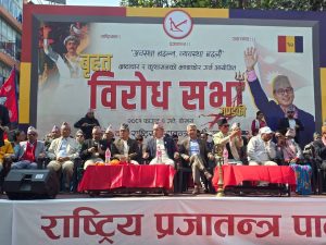 राष्ट्रिय प्रजातान्त्र पार्टीका प्रवक्ता ज्ञानेन्द्र शाहीले देशमा कुनैपनि जनता सरकारबाटै सुरक्षित नभएको बताएका छन। सरकारले जनतालाई भ्रष्टाचारको हिलोमा चुर्लुम ढुवाएर जनतालाई झुक्याएर देशलाई भुमरीमा फसाएको बताए ।प्रवक्ता शाहीले अबको विकल्प भ्रष्टाचारी नेतालाई पाता फर्काएर जनताको माझमा नाङ्गेझार बनाउन राप्रपाले नेतृत्व गर्ने बताएका हुन।
