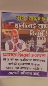 आधुनिक नेपाल राष्ट्र को एकिकरण सारा नेपाली र शाह वंशिय राजसंस्थाको संयुक्त प्रयासबाट भएको अभियानले जनाएको छ। बिगत ३ दशक देखि नेपाल र नेपाली माथि आएको संकटपुर्ण अवस्थाको निकाशका लागि महाराजधिराजबाट जुन संबोधन भएको छ यसले हामी सम्पुर्ण राष्ट्रभक्त नेपालीहरुमा आशाको दियो बलेको छ। हामीले बिगत लामो समय देखि वकालत गर्दै आईरहेको कुरा अहिले सत्य साबित भैइरहेको छ, राजसंस्था नेपालीको एकताको अभिभावक हो मिंयो हो, यसको कुनै बिकल्प अभियानले भनेको छ ।यहाँ राजसंस्था छैन भने नेपाल नै छैन। यो कुरा सबैले मनन गर्न जरुरी छ। दलाल दलतन्त्र हाबी हुंदा अहिले राजनिती नाङ्गो भएको छ, देश कमजोर बनेको छ, भ्रस्ट नेताले देशमा गरेका घोटाला काण्ड एक पछि अर्को भण्डाफोर भैइरहेका छन। पछिल्लो समयमा भएको परिवर्तन नै बिदेशी शक्ति केन्द्रको आर्थिक चलखेलमा भएका स-प्रमाण सार्वजनिक भैईसकेको छ यस्तो बेला सिङ्गो देशलाई एकढिक्का बनाउन राजा लाई साथ दिनुको विकल्प नभएको अभियानले स्पष्ट गरेको छ ।