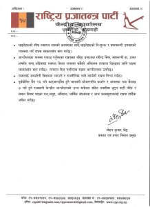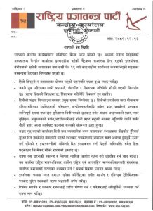 राष्ट्रिय प्रजातन्त्र पार्टी (राप्रपा) ले पार्टीका उपाध्यक्ष रवीन्द्र मिश्र र महामन्त्री डा. धवल शम्शेर राणालाई २४ घण्टाभित्र बिना शर्त रिहा गर्न सरकारलाई अल्टिमेटम दिएको छ। शनिबार बसेको केन्द्रीय कार्यसम्पादन समितिको बैठकपछि अध्यक्ष राजेन्द्र लिङ्देनले २४ घण्टाभित्र रिहा नगरिए देशभर विरोध कार्यक्रम सञ्चालन गर्दै आन्दोलनलाई तीव्र बनाउने निर्णय भएको जानकारी दिए।