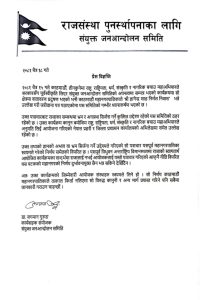 गणतन्त्र , संघीयता र धर्मनिरपेक्षता विरोधी ‘राजसंस्था पुनर्स्थापनाका लागि संयुक्त जनआन्दोलन समिति’ ले पूर्वराजा ज्ञानेन्द्र शाहलाई जरिवाना गराउन पत्र काट्ने काठमाडौँ महानगरपालिकाको निर्णयप्रति विज्ञप्ति मार्फत आपत्ति जनाएको छ ।