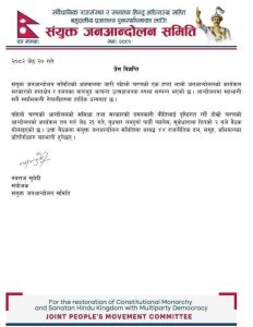 राजसंस्था र हिन्दुराज्य पुनर्थापनाको मागसहित आन्दोलन गर्दै आएको ‘संयुक्त जनआन्दोलन समिति’ नयाँ रणनीति बनाउने तयारीमा जुटेको छ । पहिलो चरणको आन्दोलन उत्साहजनक रुपमा सम्पन्न भएको निष्कर्ष निकालेको समितिले आज दिउँसो २ बजे बैठक बसेर अर्को चरणको आन्दोलन सार्वजनिक गर्ने तयारी गरेको छ ।